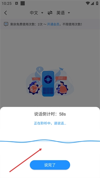 4、开启语音翻译功能后,页面会呈现【说话倒计时:58s】以及聆听的提示,当语音输入结束,点击【说完了】按钮就能完成此次翻译操作。