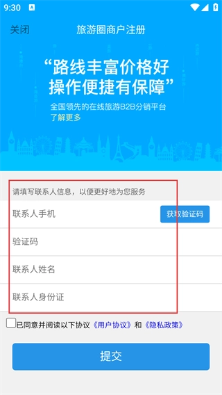 4、在【旅游圈商户注册】页面,按顺序填写【联系人】-【验证码】-【联系人姓名】-【联系人身份证】,勾选相关协议后点击【提交】按钮。