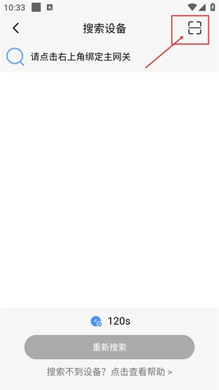 2、进入【搜索设备】页面后,点击右上角的对应图标,会弹出功能选项弹窗,目前提示需要绑定主网关。