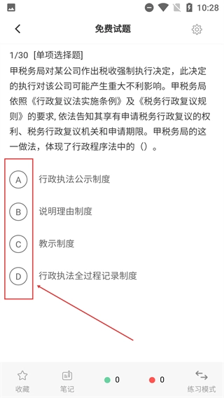 3、进入【试题】板块后,浏览【1/30-单项选择题】的题干信息,从给出的选项里挑选出正确答案来完成该题的作答。