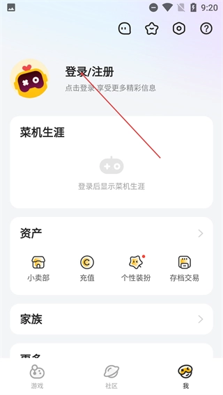 2、进入后点击【登录/注册】区域,即可启动登录流程,完成登录后,后续就能查看【菜机生涯】【资产】等功能模块了。