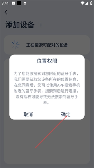 3、添加设备过程中,系统会弹出【位置权限】请求窗口,此时需点击【确定】来授予权限,这样才能顺利搜索并配对周边的蓝牙手表。