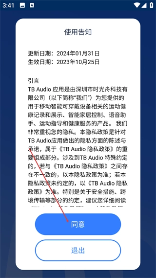 1、打开【TB-Audio】应用后,仔细阅读其【使用告知】里与隐私政策相关的内容,确认无误后点击【同意】按钮,即可进入应用的主界面。