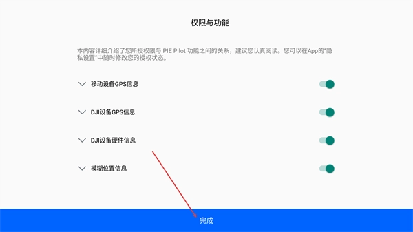 3、进入【权限与功能】页面,确认【移动设备GPS信息】等各项权限均已开启,随后点击【完成】按钮,即可完成权限配置。