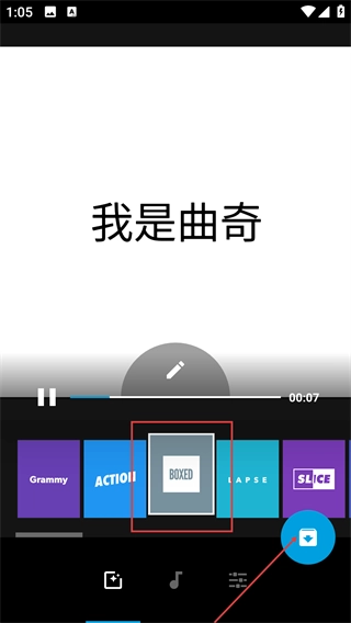 4、选择【Boxed】模板后,预览标题为【我是曲奇】的视频效果,确认无误后点击右下角按钮,就能保存使用【BOXED】模板制作的视频。