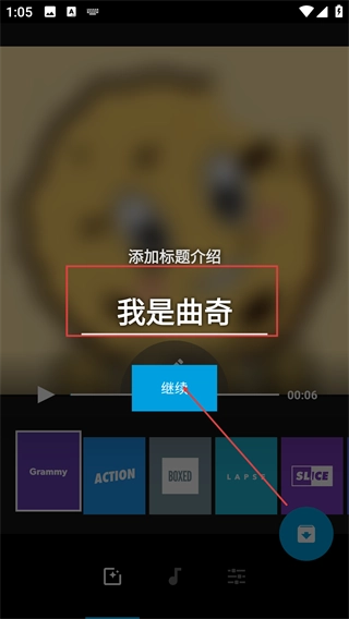 3、进入视频编辑页面后,添加类似“我是曲奇”的标题介绍内容,随后点击【继续】按钮以推进后续流程。