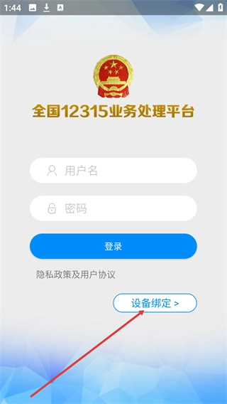 1、进入全国12315业务处理平台的登录界面,找到并点击【设备绑定】选项,即可进入设备绑定的操作页面。