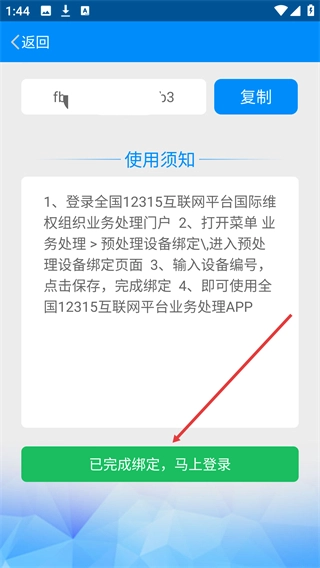 2、进入设备绑定页面后,按照流程完成设备绑定操作;绑定成功后,点击【已完成绑定,马上登录】按钮,即可回到登录界面,为后续的登录步骤做准备。