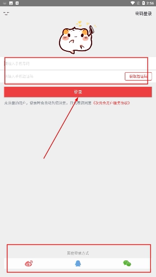 2、进入登录页面后,可选择在账号登录输入框中填写账号,点击【获取验证码】按钮,随后点击【登录】按钮完成登录;此外,也可以选择其他登录方式,例如第三方账号登录。