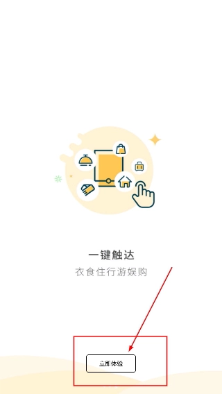 1、在应用引导页面点击【立即体验】按钮,即可进入应用主功能区,使用涵盖衣食住行的综合服务。