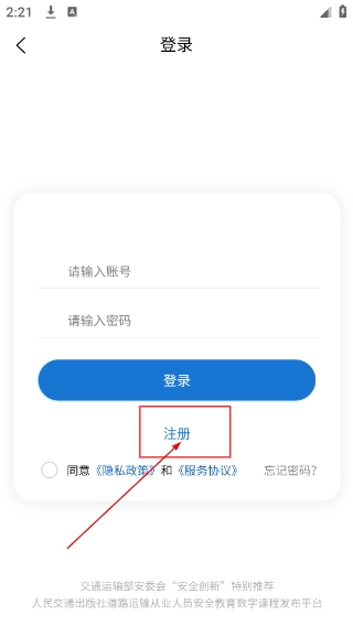 1、在【登录】页面,若您还未注册账号,可先勾选【同意隐私政策和服务协议】,然后点击【注册】按钮进入注册界面。