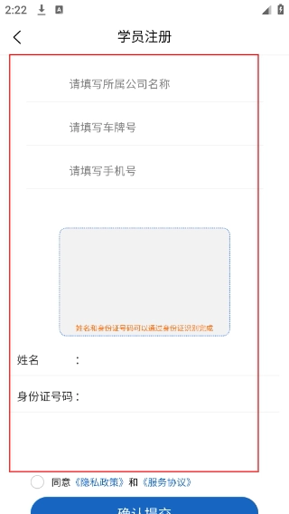 4、进入【学员注册】页面,需填写【请填写所属公司名称】-【请填写车牌号】等信息,完善身份资料后勾选协议提交。