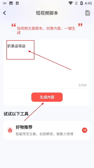3、在短视频脚本页面的输入框中,填写创作主题(例如“奶茶店探店”),填写完毕后点击【生成内容】按钮,即可启动脚本创作流程。