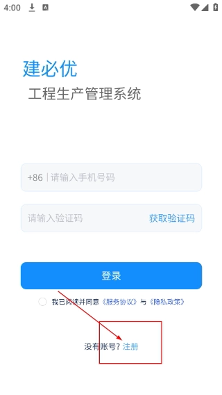 1、在【建必优-工程生产管理系统】的登录页面,用户可输入账号和验证码完成登录;若尚未注册账号,点击【没有账号?注册】按钮即可进入注册流程。