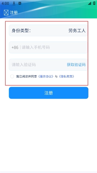 3、进入【注册】页面,选定身份类型后,填写账号、获取并输入验证码,勾选相关协议后点击【注册】按钮,即可完成账号注册流程。