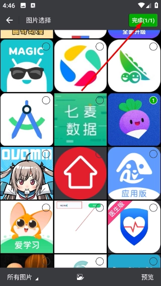 2、进入图片选择界面后,勾选目标图片(例如紫色萝卜样式的图片),点击【完成】按钮,就能进入该图片的贴纸编辑页面。