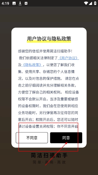 1、在【简洁扫描助手】弹出的【用户协议与隐私政策】窗口里,仔细阅读条款内容后,点击【同意】按钮,即可进入这款优化类应用的操作界面。