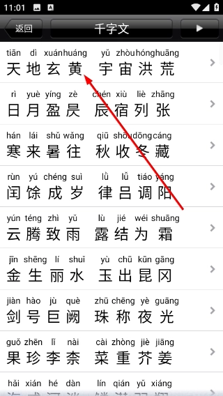 1、在《千字文》阅读页面点击右上角的搜索图标,即可进入带有拼音标注的《千字文》全文列表界面。