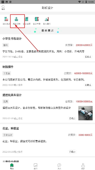 2、进入“彩虹设计”页面后,点击上方的对应入口,查看各类设计项目(如小学生书包设计)的详情信息。