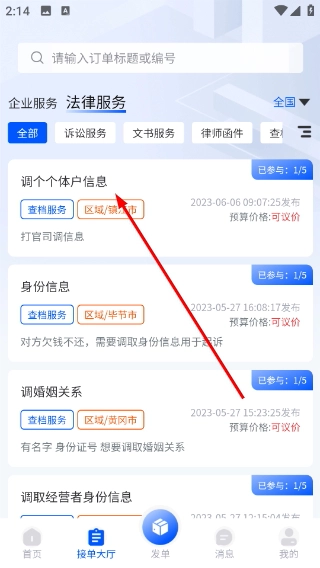 3、在法律服务分类下,能够查看具体的接单需求,像【调个体户信息】这类,了解需求的区域、预算等信息,筛选出可以承接的业务。