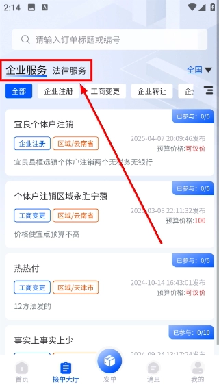 2、在接单大厅页面,能够切换【企业服务/法律服务】分类,查看对应类别的接单需求,像企业注册、工商变更这类业务都包含在内。