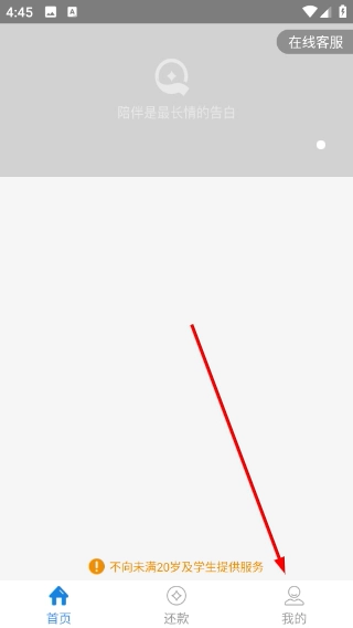 1、该页面底部设有【首页】【还款】【我的】功能入口,要留意页面提示“不向未满20岁及学生提供服务”,能借助底部入口切换到相应功能页。