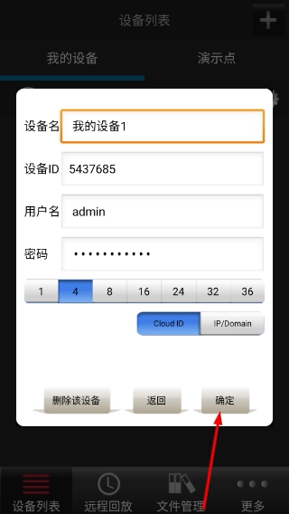 2、在设备信息填写界面,依次输入【设备名】、【设备ID】、【用户名】和【密码】,然后点击对应的按钮,就能保存设备信息了。