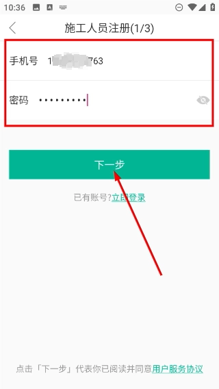 4、在【施工人员注册(1/3)】页面填写【号】、设置【密码】,点击【下一步】完成注册,点【立即登录】可返回登录页。