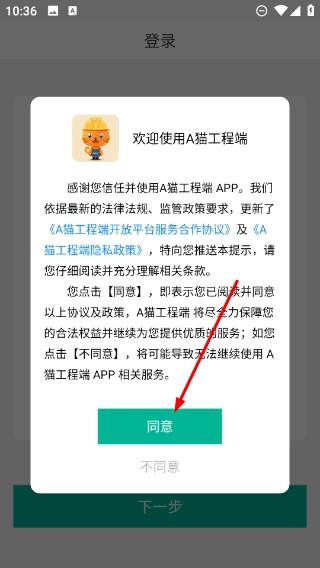 1、进入【A猫工程端】后,请先仔细阅读【A猫工程开放平台服务合作协议】与【A猫工程端隐私政策】,点击【同意】按钮后,即可继续使用相关功能。