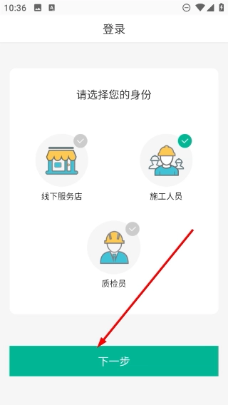 2、在【请选择您的身份】界面勾选对应的角色选项,像【线下服务店】【施工人员】这类,勾选完成后点击【下一步】按钮,即可进入登录页面。