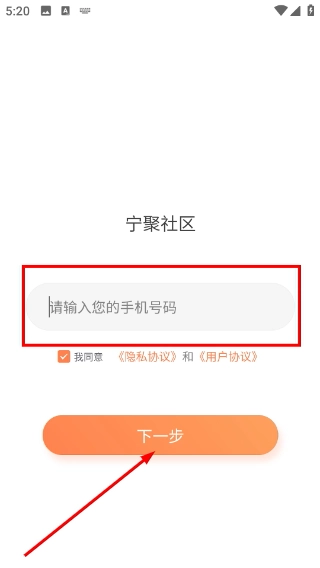 1、在宁聚社区的注册页面,首先需要在输入框中填写号码,接着勾选同意《隐私协议》与《用户协议》,随后点击“下一步”按钮,就能继续推进注册流程。