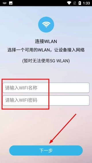 2、进入WLAN连接页面后,在输入框中填写可用的WiFi名称和密码(需注意目前暂不支持5G-WLAN),填写完成后点击“下一步”,设备即可接入网络。