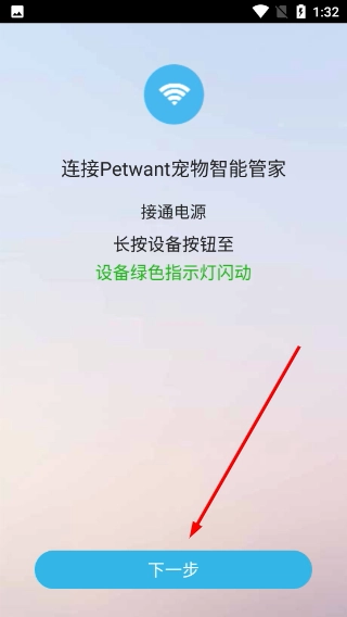 1、在Petwant宠物智能管家的连接引导页面,依据提示接通设备电源,接着长按按钮直到绿灯开始闪动,随后点击“下一步”,即可进入网络配置环节。