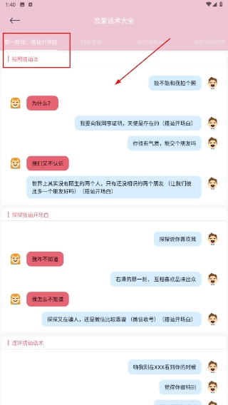 3、切换到【约会全套】分类,就能查看适合约会场景的完整话术流程,帮助你更好地进行交流表达。