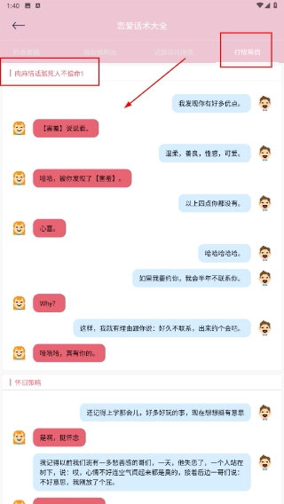 4、在【打情骂俏】聊天话术区域,逐字学习有助于后续随时运用。