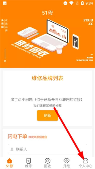 1、打开【51修】首页,要是【维修品牌列表】加载出现问题,点击【刷新】按钮能试着重新获取数据,另外还可以查看【闪电下单】的入口。