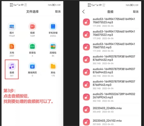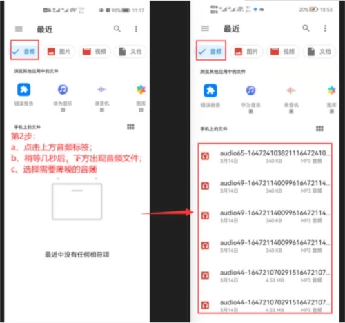 2、点击顶部的“音频”标签,等待几秒后,系统会自动检索手机里的音频文件,此时下方会显示出这些文件,具体可参考下图右侧的展示效果。