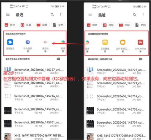 2、在下图的方框位置找到文件管理(QQ浏览器),要是没找到,就向左滑动页面,找到后打开它;