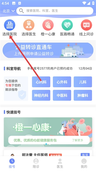 1、在医疗服务首页,找到【选择医院】功能按钮并点击,就能进入包含多家医院的列表选择页面。