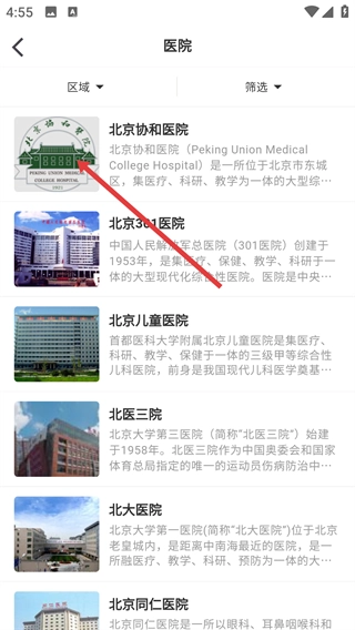 进入医院列表页面后,找到并点击目标医院(例如北京协和医院),即可进入该医院的科室分类页面。