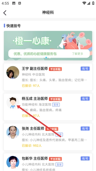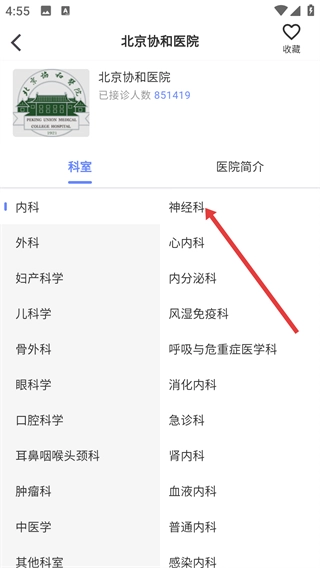 3、在医院的科室页面中,找到你要找的科室(例如神经科)并点击它,这样就能进入到该科室对应的医生信息列表页面了。
