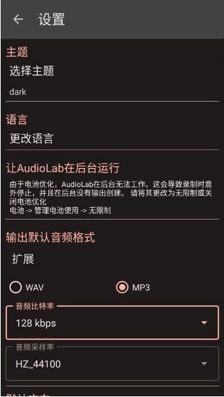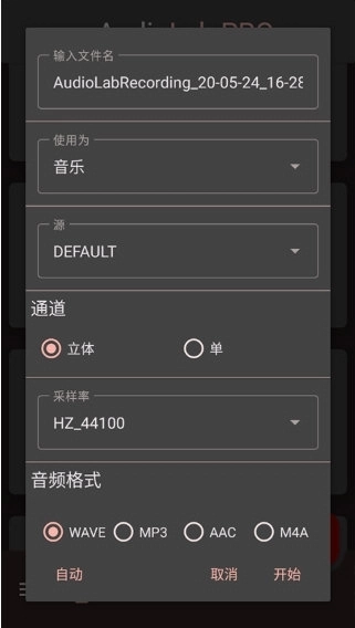 音频录音机具备录制声音与音乐的功能,提供了所需的音源、通道、采样率、音频格式等基础设置,同时还包含噪音抑制器、自动增益、跳过静音等高级选项。