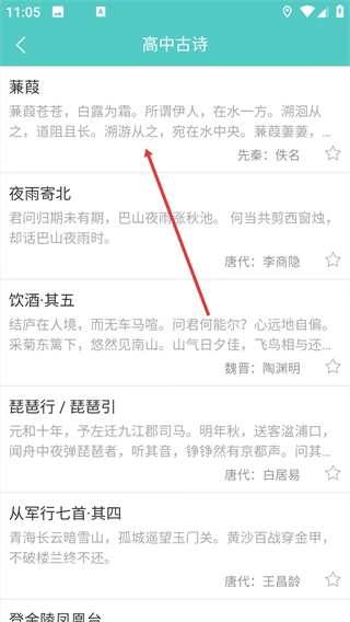 3、在高中古诗列表里找到并点击目标诗词(例如《蒹葭》),即可进入该诗词的详情阅读页面。