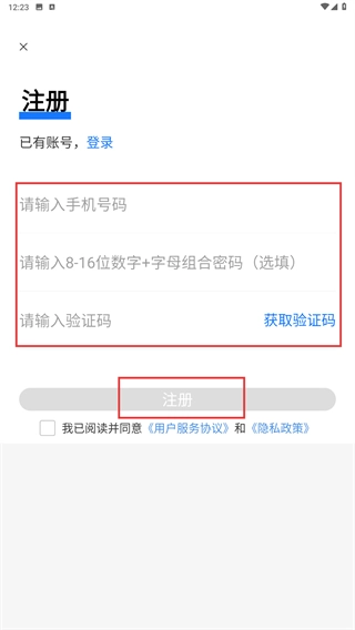 4、注册账号时,需先输入号码,接着设置密码,然后获取并填写验证码,再勾选相关协议,最后点击【注册】按钮,即可完成账号创建。