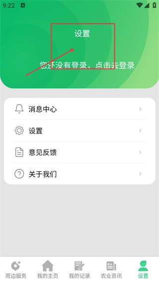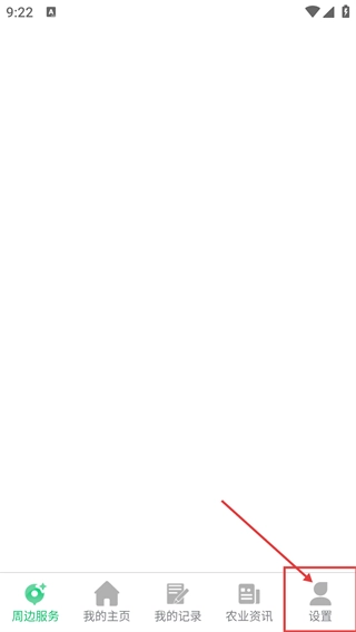 1、打开软件界面后,底部功能栏设有【周边服务】【我的主页】【农业资讯】【设置】这几个选项,点击【设置】就能进入对应的功能操作界面。