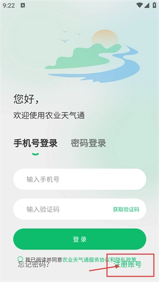 3、进入【农业天气通】的登录界面后,可选择【账号登录】或【密码登录】两种方式,若需创建新账号,可点击界面下方的【注册账号】按钮。