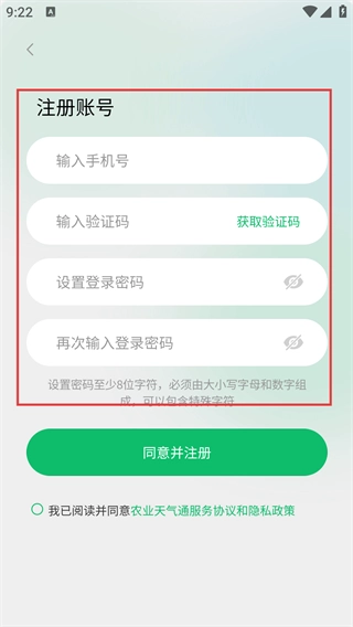 4、进入【注册账号】界面后,要填写【输入号】和【输入验证码】,接着设置【登录密码】——密码需至少8位,且包含大小写字母与数字,之后还需再次确认该密码。
