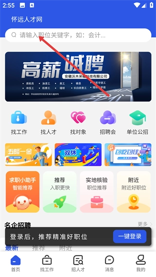 1、在怀远人才网首页,点击顶部的搜索框,准备输入职位关键字来查找对应的岗位。