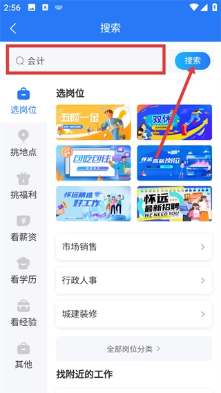 2、在搜索页面的搜索框里输入“会计”,接着点击右边的搜索按钮,就能得到相关的岗位列表。