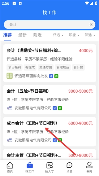 3、在会计岗位列表里,找到“成本会计(五险+节日福利)”对应的岗位条目并点击,即可进入该职位的详情页面。